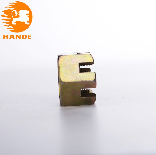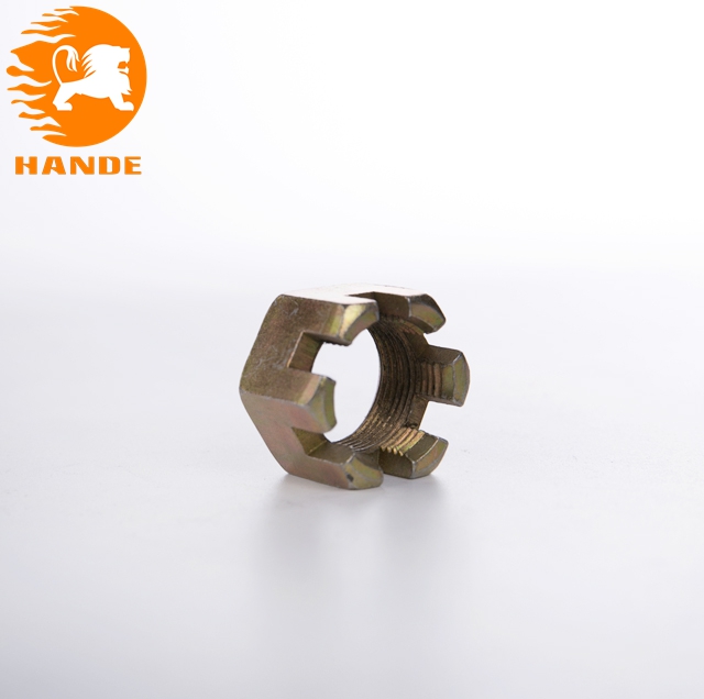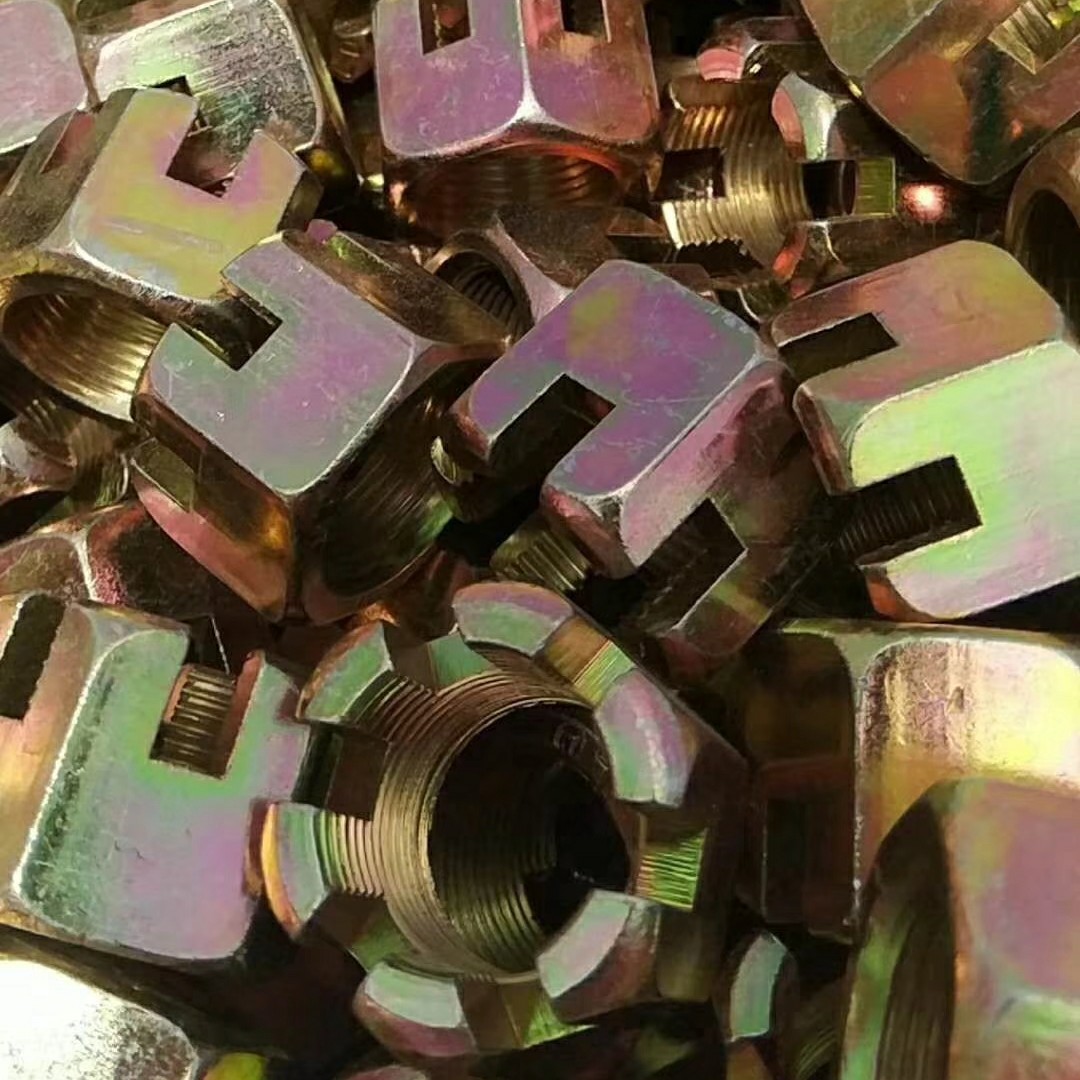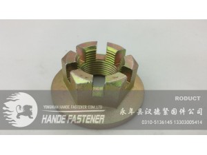開槽螺母的作用:就是通過緊固穿過前后輪輪軸螺桿固定車輛前后輪軸,使車架和輪胎固定在一起,為了防止螺母松脫,必須用開口銷通過開槽螺母的槽進行固定,而開口銷要固定住開槽螺母就必須從輪軸螺桿中間穿過,通常輪軸螺桿兩頭都需要鉆孔,孔的直徑大小和開槽螺母的槽寬和槽深決定了選用什么規(guī)格的開口銷,當(dāng)選用 的輪軸螺桿和開口銷和開槽螺母都比較匹配的時候,螺母就通過輪軸螺桿固定住前 輪和車架,開口銷通過輪軸螺桿的孔緊固件住了開槽螺母,使開槽螺母不產(chǎn)生松脫, 使車輛在運動的時候也不松脫.